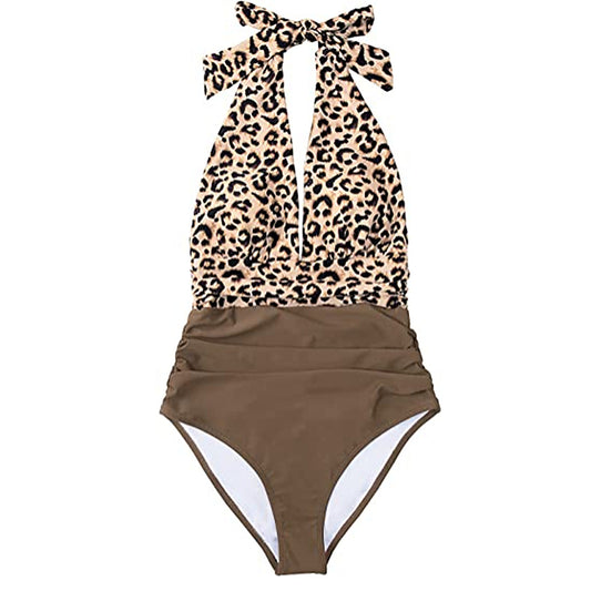 Halter Backless Bikini Waist Print Leopard Color Block One-Piece Swimsuit for Women
